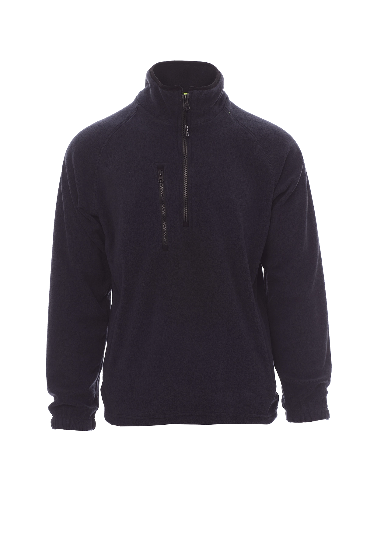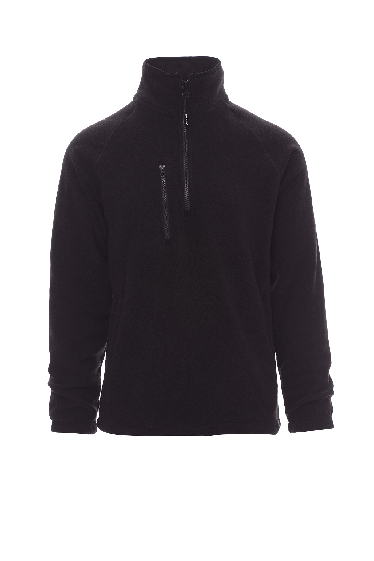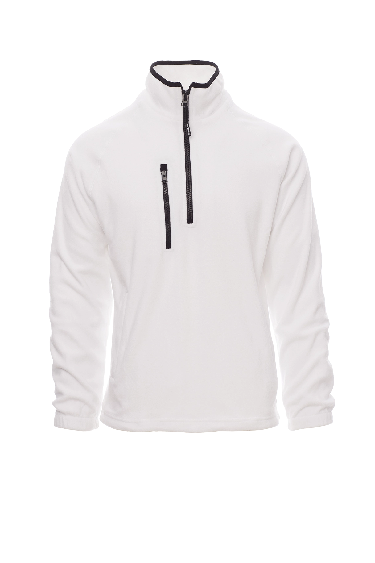 Zip-Fleecepullover mit kurzem, schwarzem 8 mm Reißverschluss aus Kunststoff, Raglanärmeln, regulierbarem Kordelzug in der Taille, elastischen Ärmelbündchen, zwei Taschen mit verdecktem Reißverschluss, einer Vordertasche mit Reißverschluss, Kragen mit verstärktem Rand in Kontrastfarbe, verstärkten Nähten.