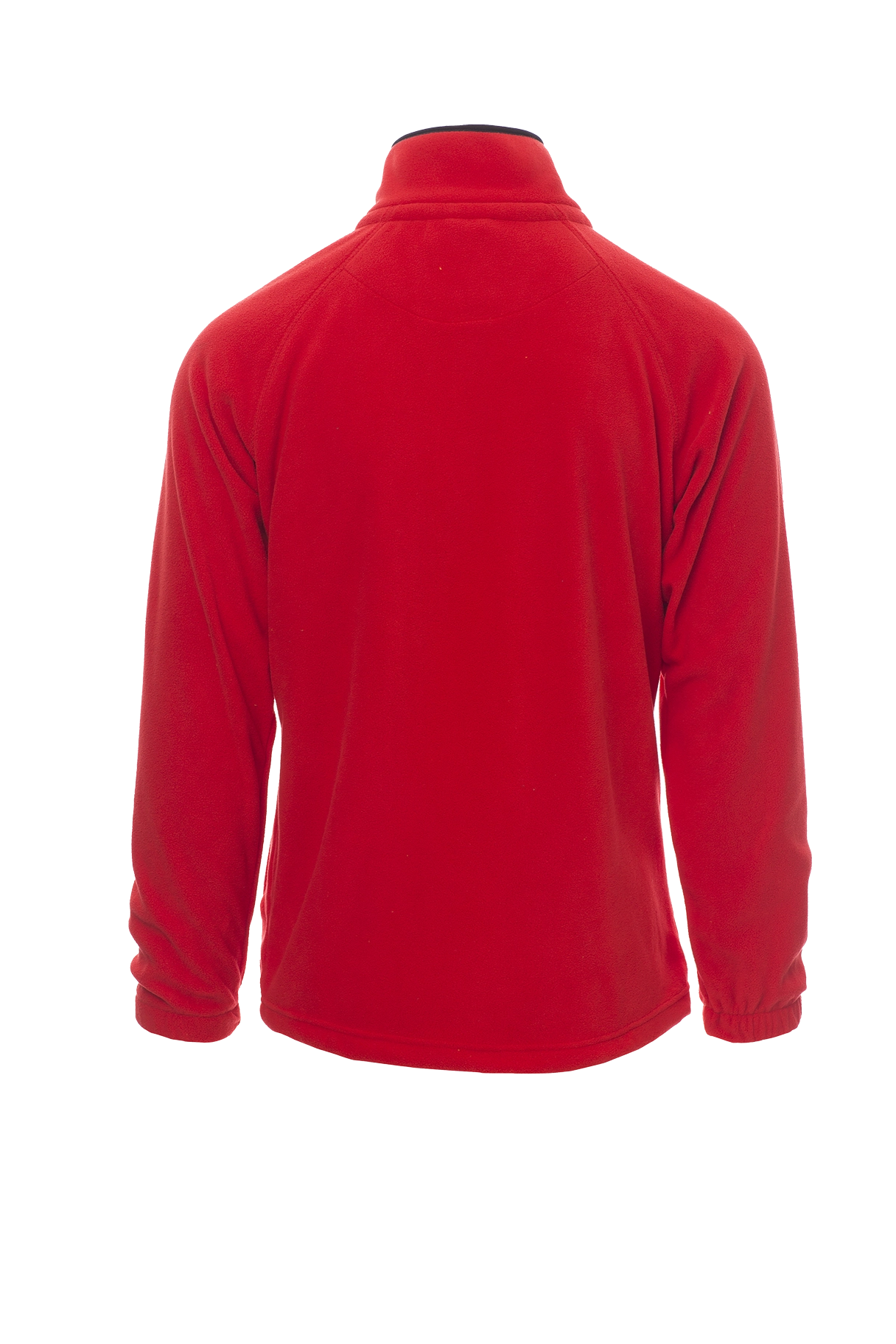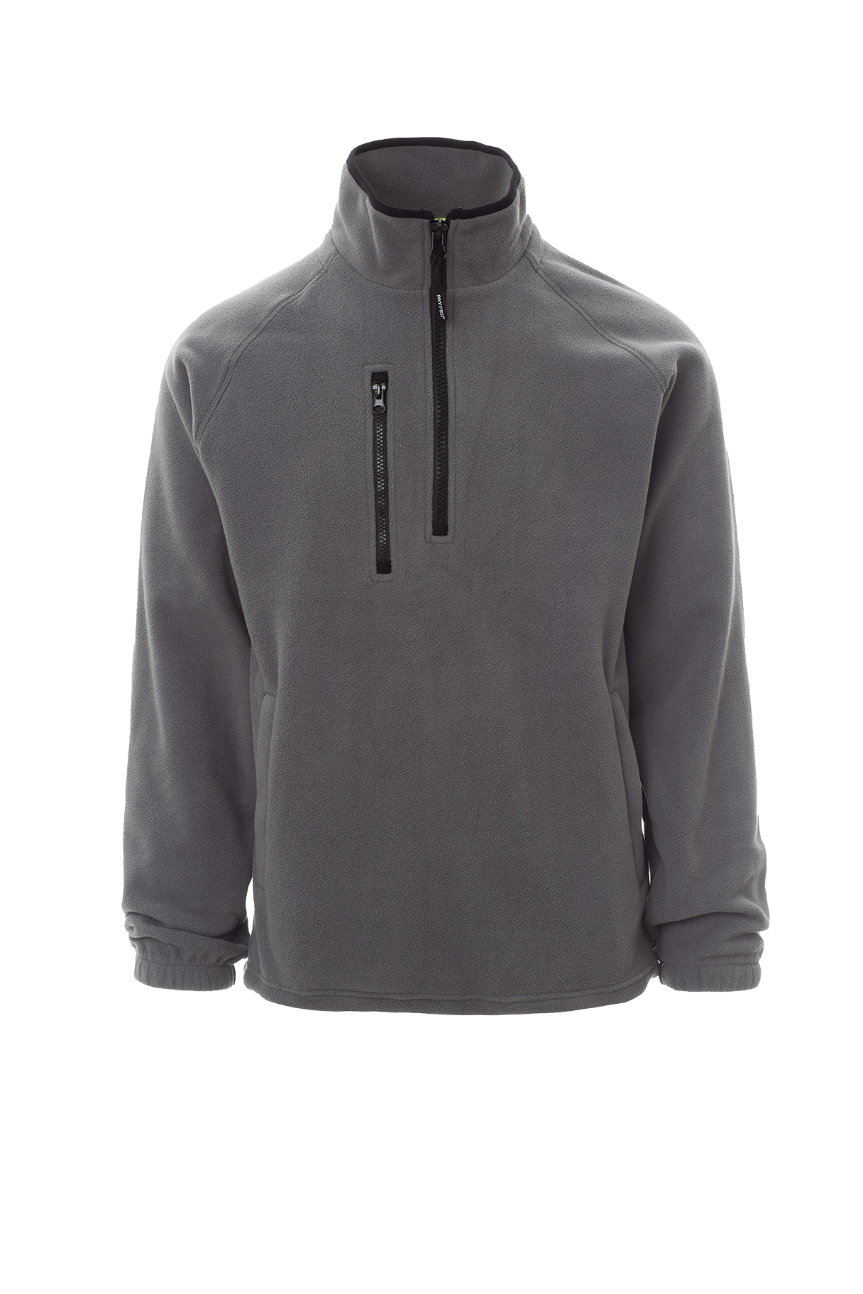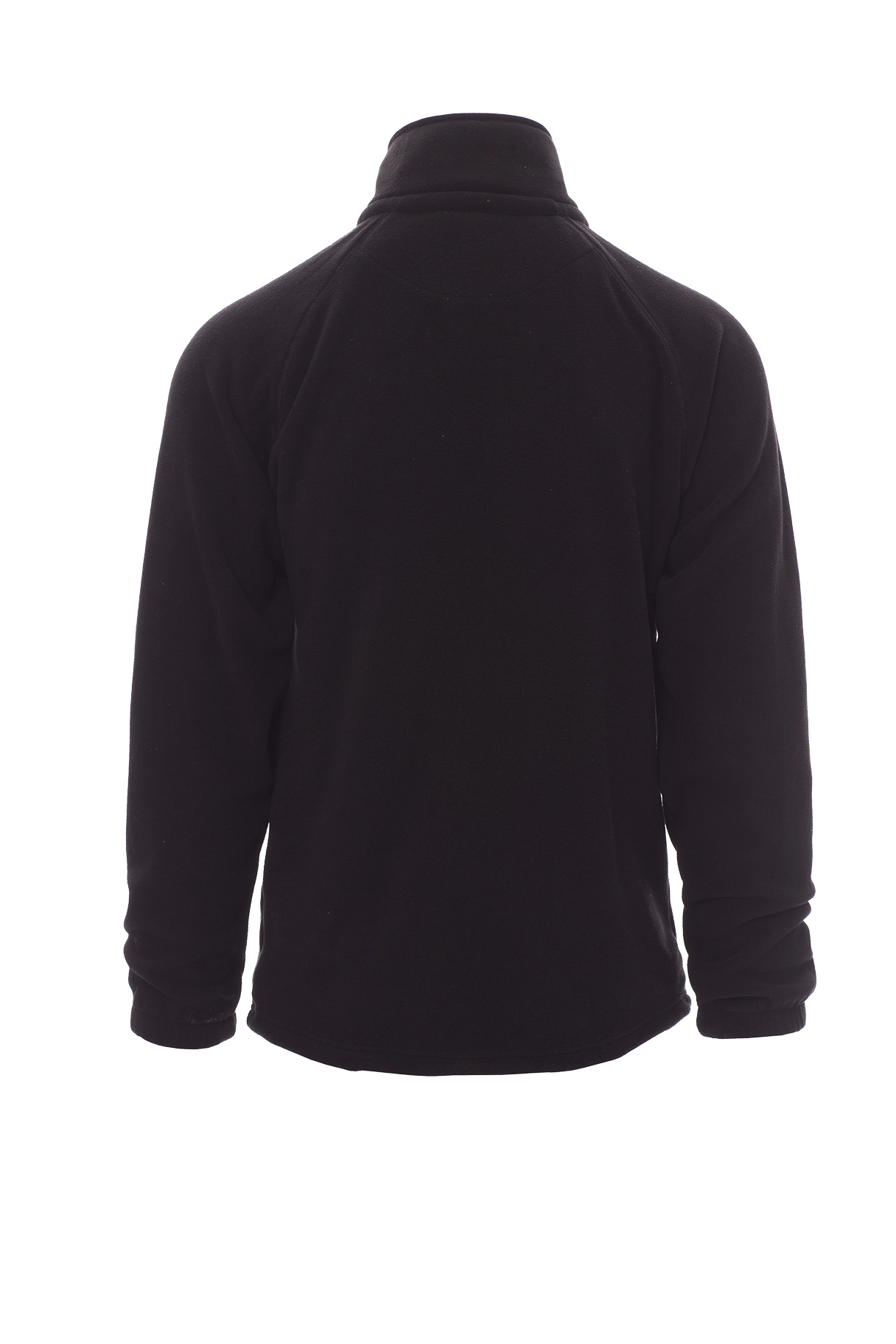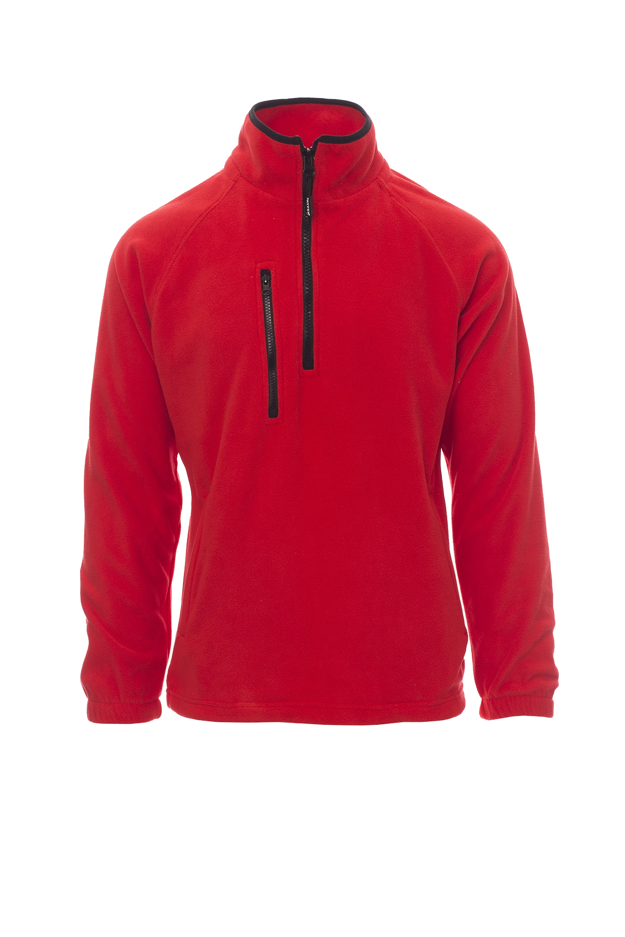 Zip-Fleecepullover mit kurzem, schwarzem 8 mm Reißverschluss aus Kunststoff, Raglanärmeln, regulierbarem Kordelzug in der Taille, elastischen Ärmelbündchen, zwei Taschen mit verdecktem Reißverschluss, einer Vordertasche mit Reißverschluss, Kragen mit verstärktem Rand in Kontrastfarbe, verstärkten Nähten.