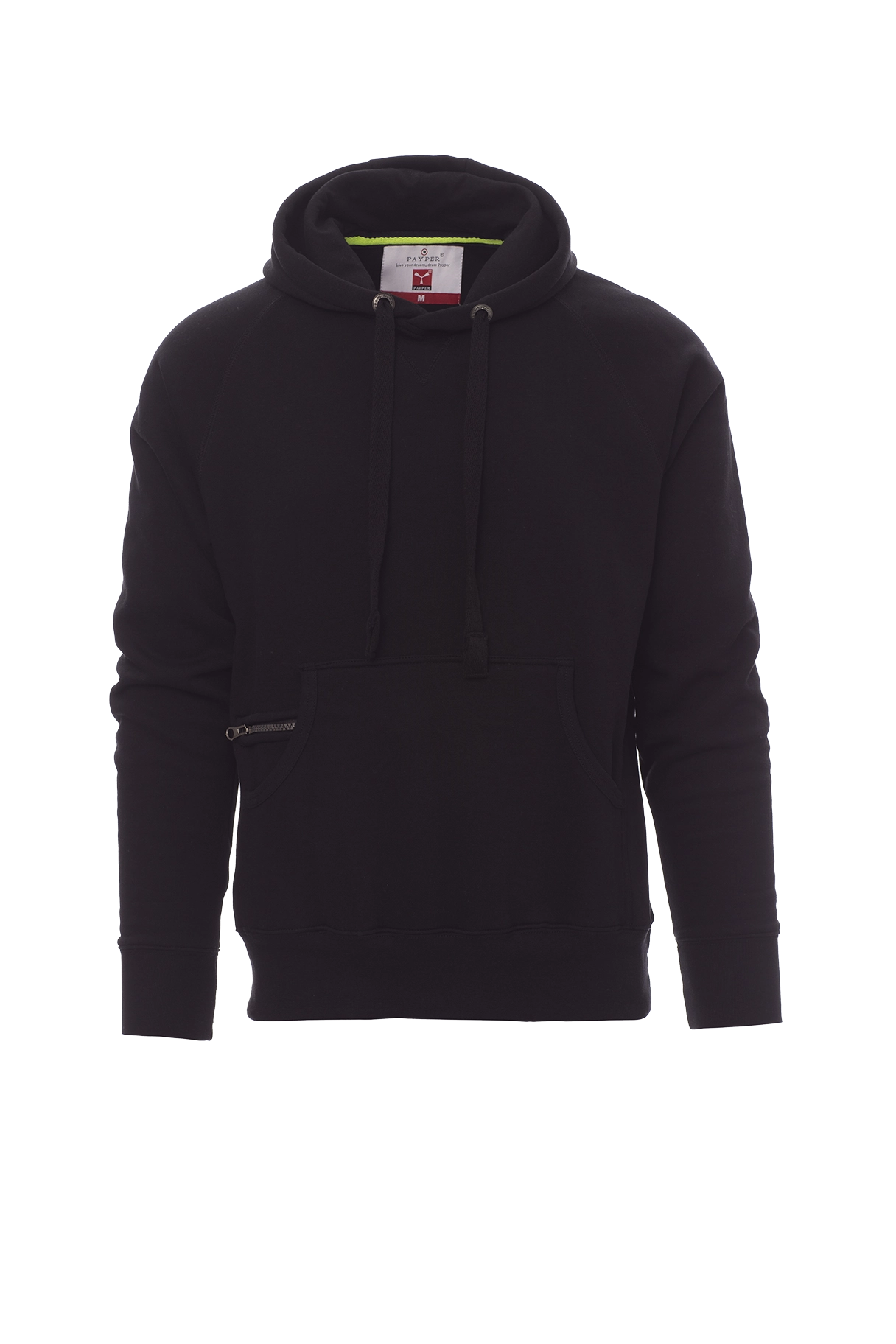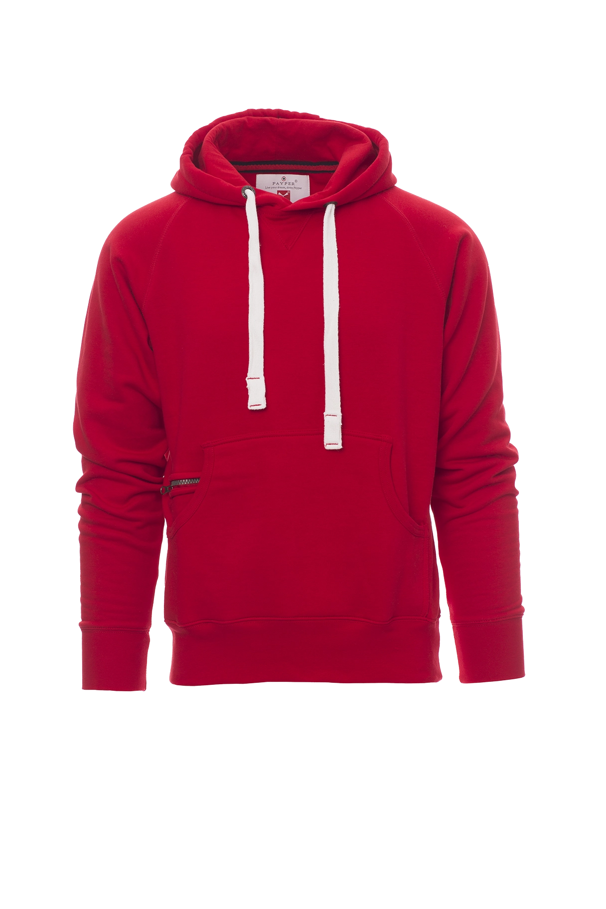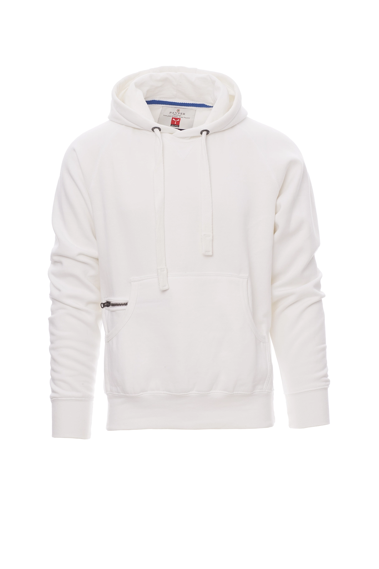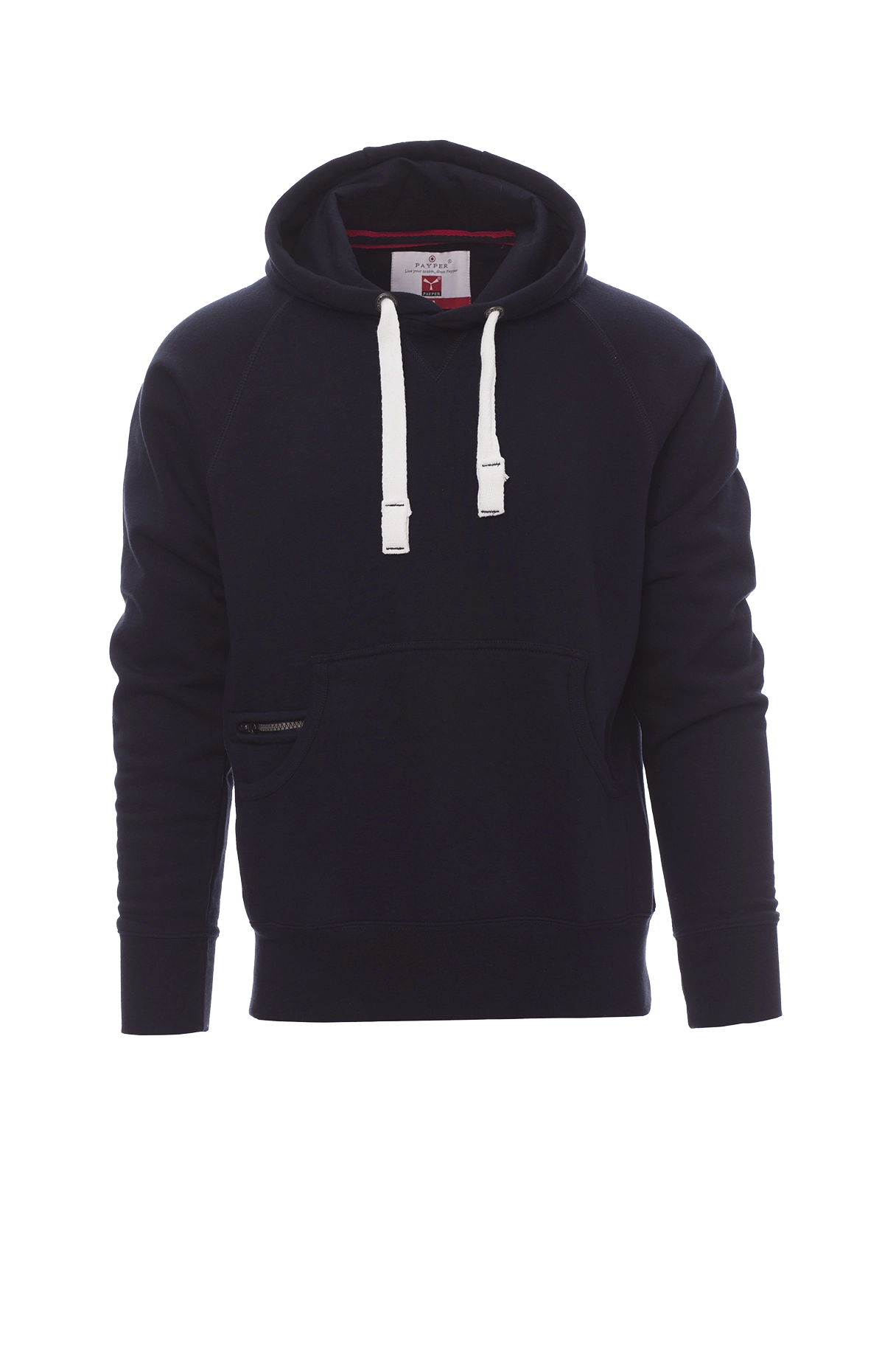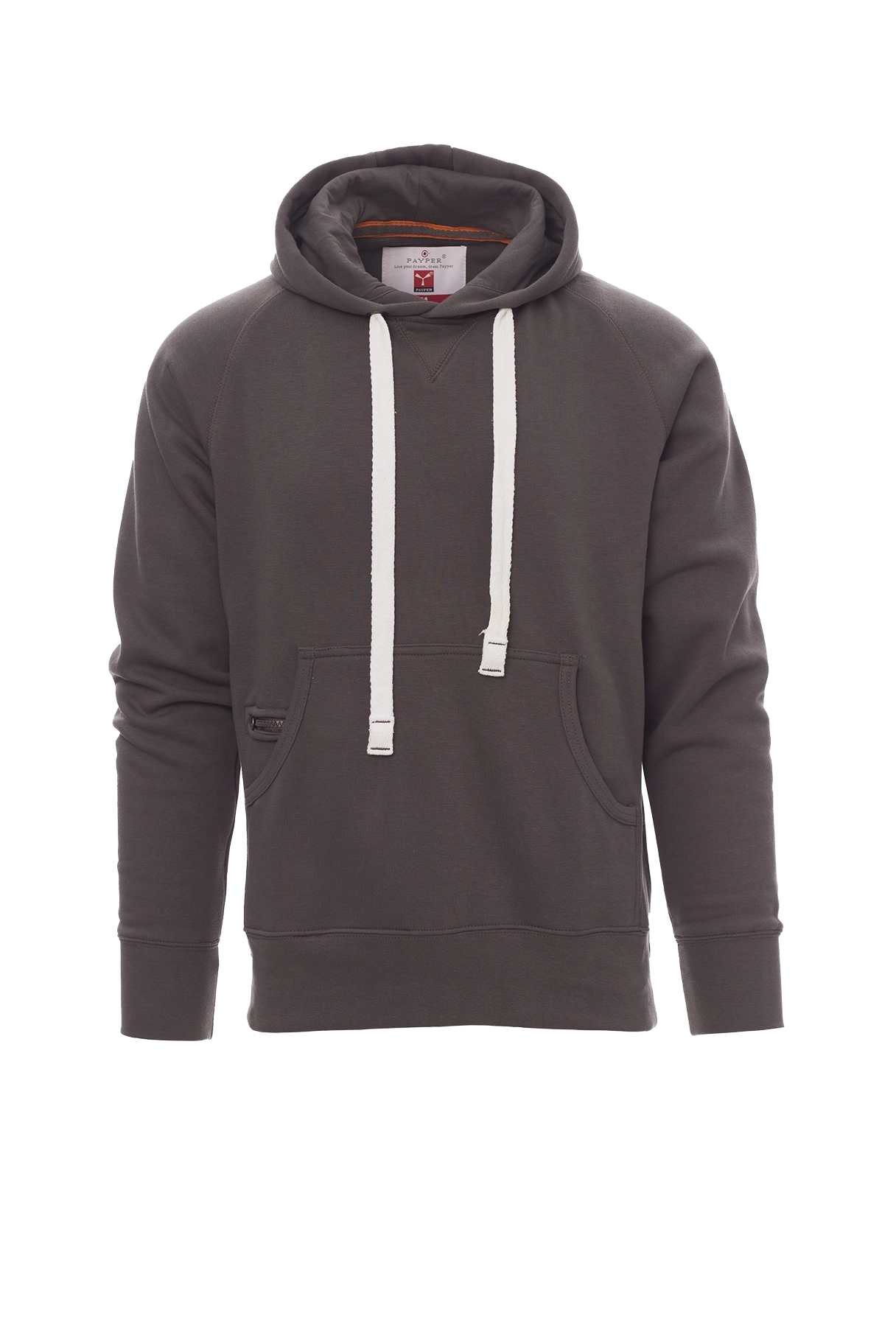 Herren-Sweatshirt mit Kapuze mit zwei Nähten und weißem Kordelzug, Nähten Ton-in-Ton und Metallösen, Raglanärmeln, V-Ziernaht am Ausschnitt, Kängurutaschen, Reißverschlusstäschchen, elastischem Feinripp an Ärmeln und Taille, verstärkten Nähten.
