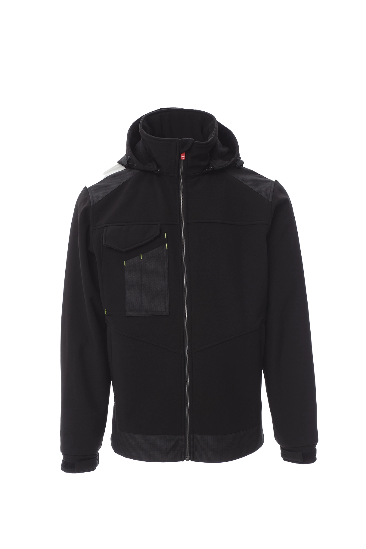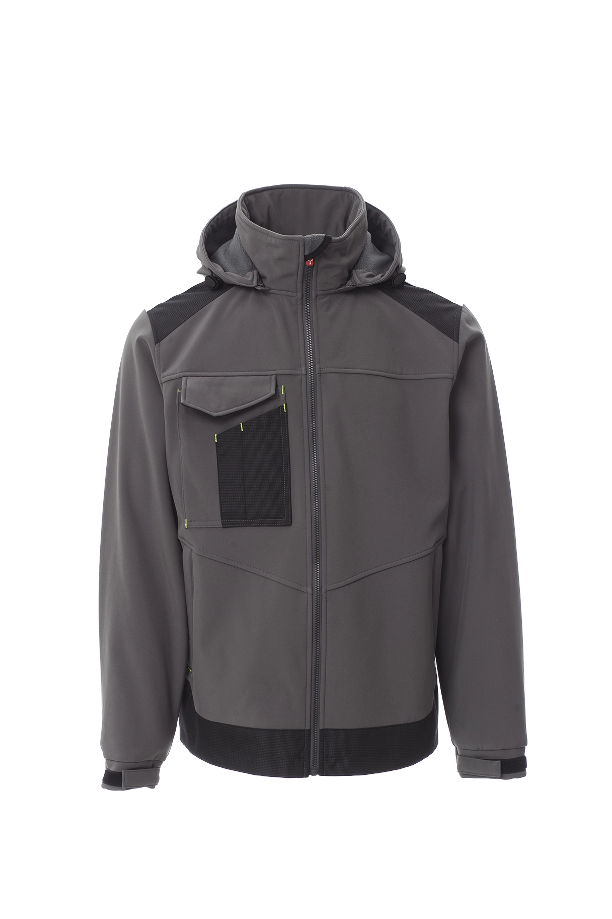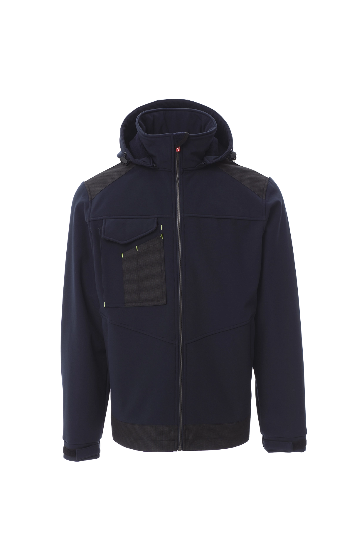 Taillierte Herrenjacke, Kugelärmel, durchgehender SBS-Reißverschluss aus Kunststoff mit „Semi-Auto-Lock“-Metallschieber, 2 seitliche Reißverschlusstaschen, 1 multifunktionale Brusttasche mit verdecktem Ausweishalter und LOCK SYSTEM-Verschlusspatte, 3M-Reflexstreifen an den Schultern, elastische Manschetten mit Klettverschluss, abtrennbare Kapuze mit verstellbarem elastischem Kordelzug mit Stoppern.