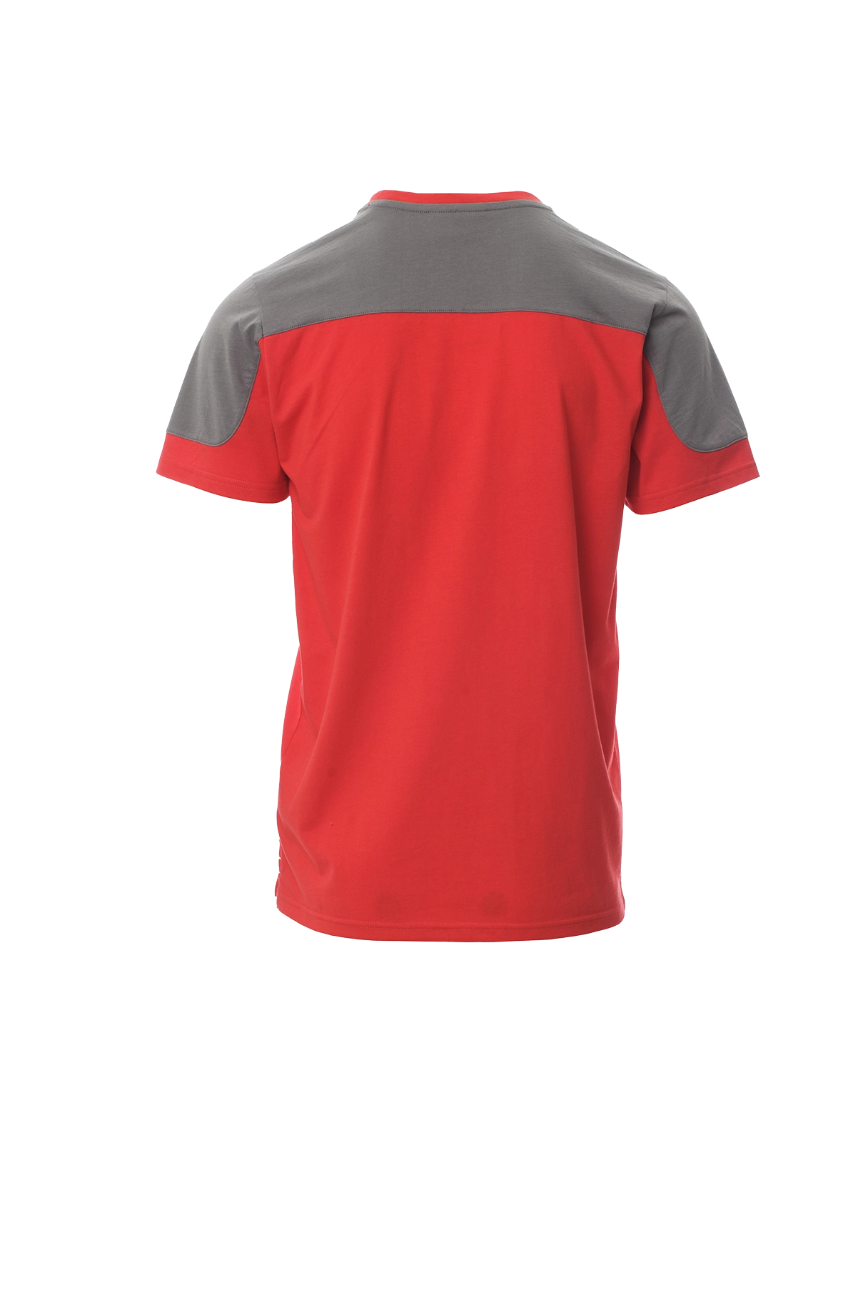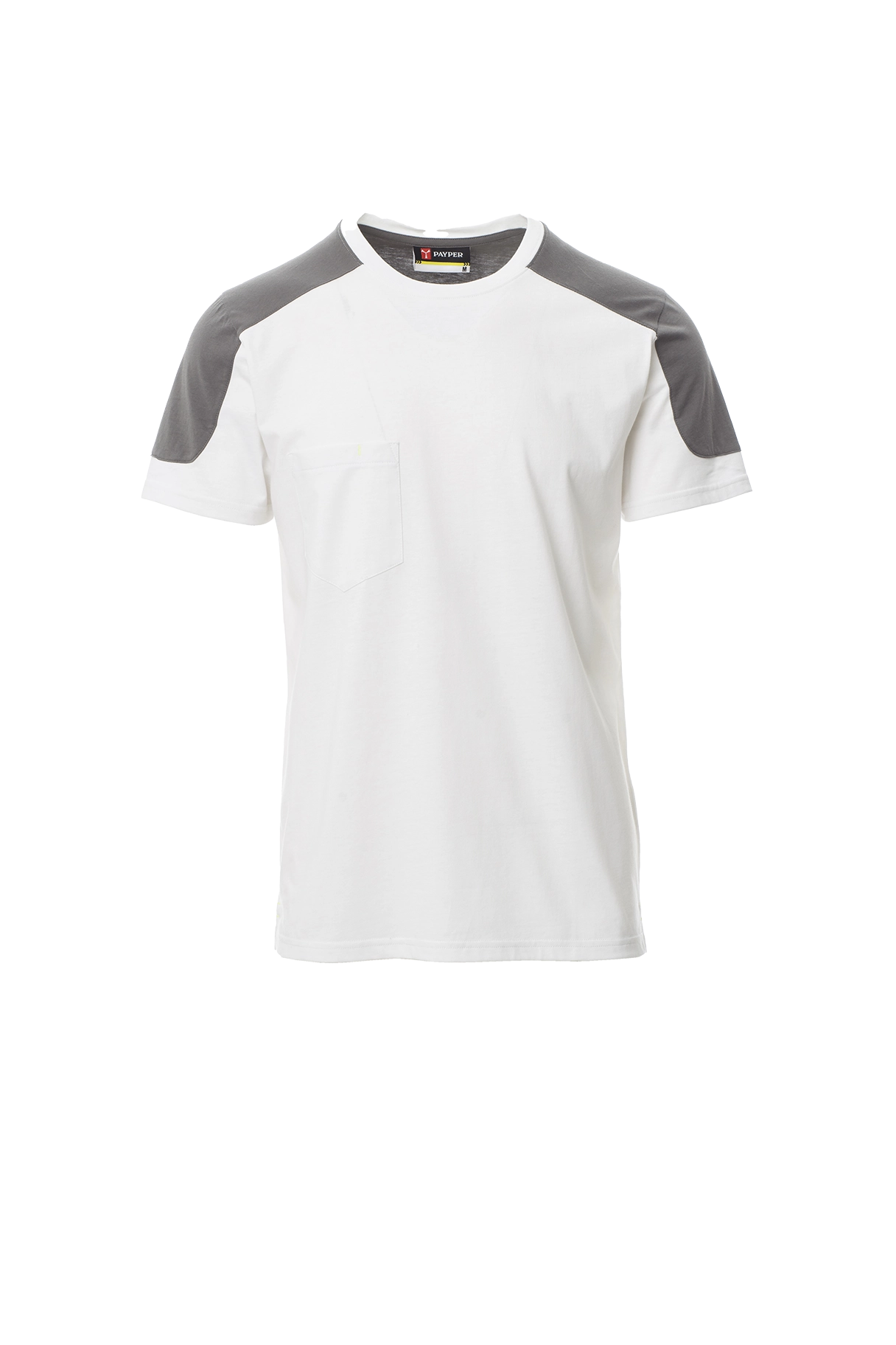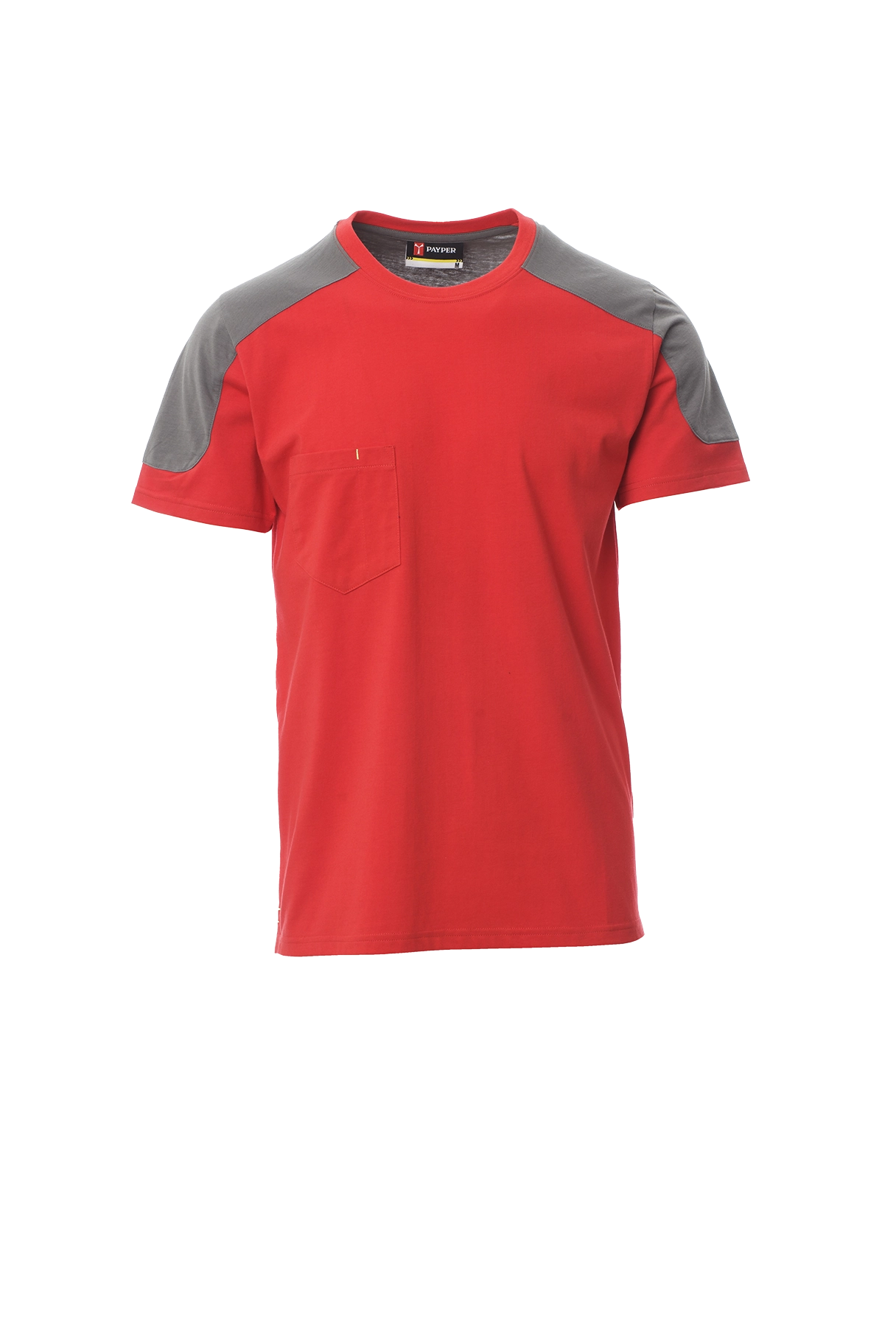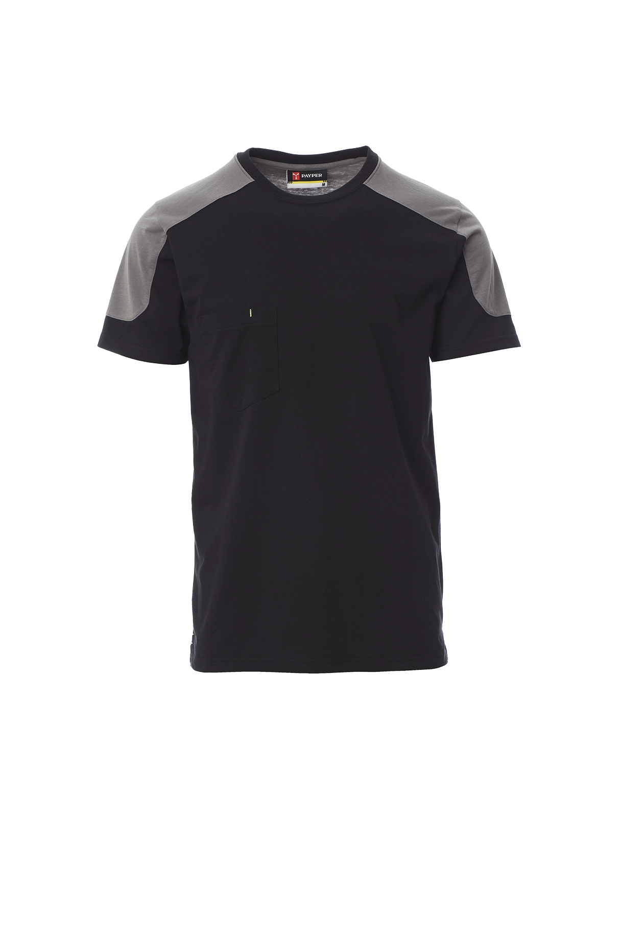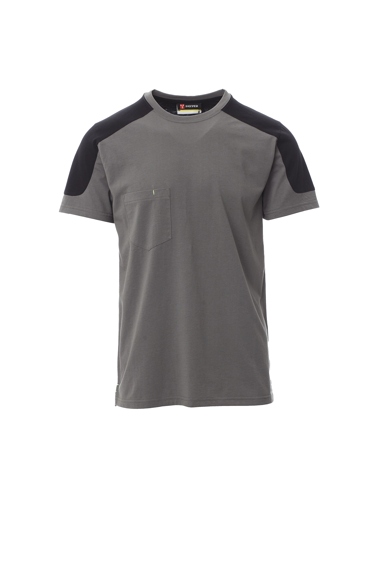 Zweifarbiges T-Shirt, Brusttasche mit Stifthalter, Nackenband und seitliches Verstärkungsband.